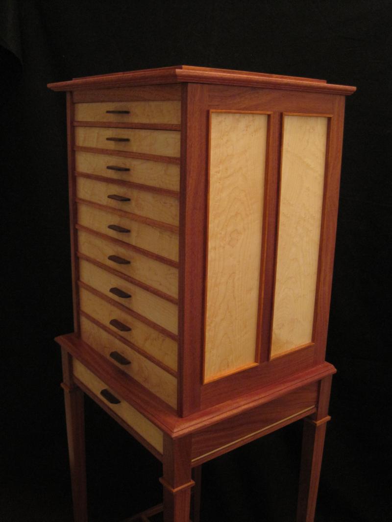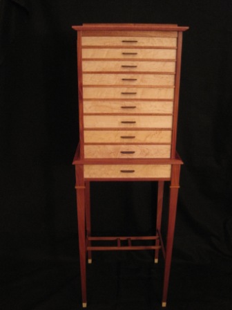 This Jewelry Chest on Stand was shown at the 2010 29th Annual Design in Wood Show in San Diego. It was also presented at the Orange County Art Show where it received an Honorable Mention.